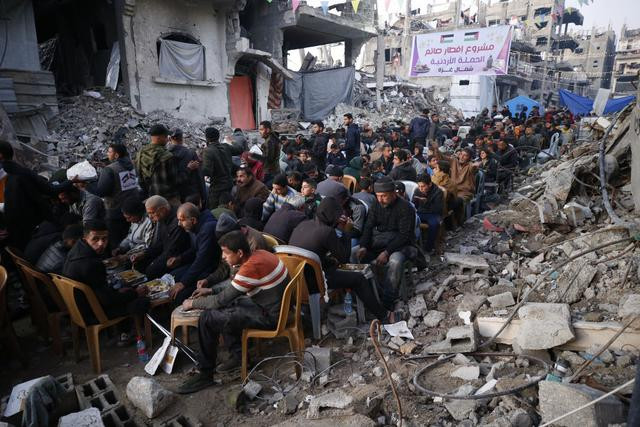 在加沙地带北部杰巴利耶的废墟上,巴勒斯坦人在斋月的第一天共进开斋饭(3月1日摄)。