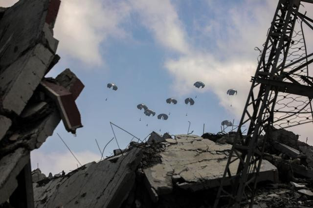 这是加沙城上空的空投物资(8月8日摄)。