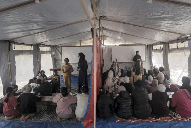 孩子们在加沙地带中部代尔拜拉赫的一处临时庇护所上课(1月6日摄)。