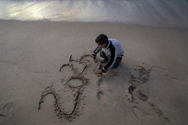 一名男孩在加沙地带代尔拜拉赫的海滩写下“2025”字样(2024年12月31日摄)。