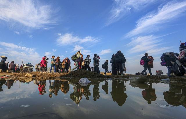 在加沙地带中部努赛赖特难民营附近,流离失所的民众行进在返回加沙地带北部的路途上(1月28日摄)。