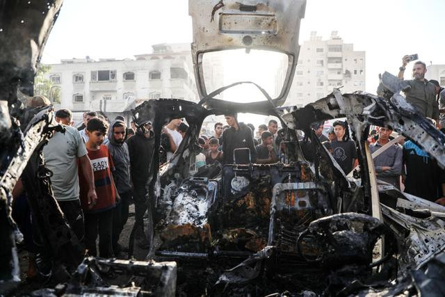 11月22日,人们在加沙城西部查看被以色列无人机炸毁的汽车。以色列当日对加沙地带多地发动空袭,造成上百人死伤。