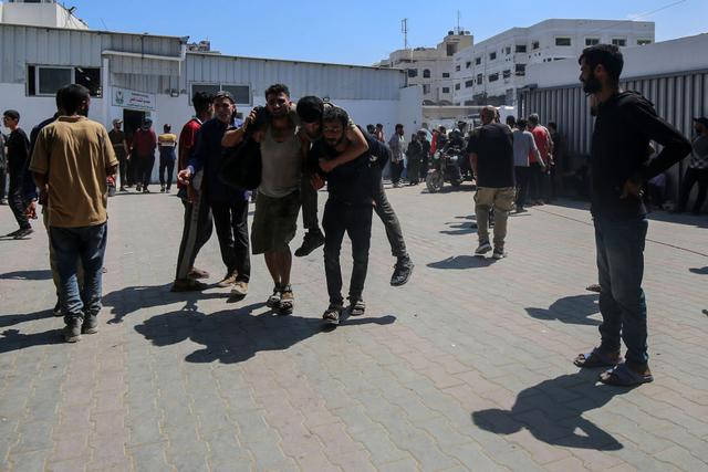 7月20日,以色列军队袭击加沙城西北部等待领取援助物资的人群,造成至少58人死亡,60人受伤。这是伤员被转移至加沙城的一所医院。