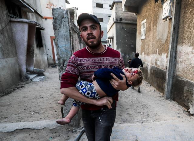 在加沙地带北部杰巴利耶难民营,一名男子怀抱受伤的女孩(4月17日摄)。