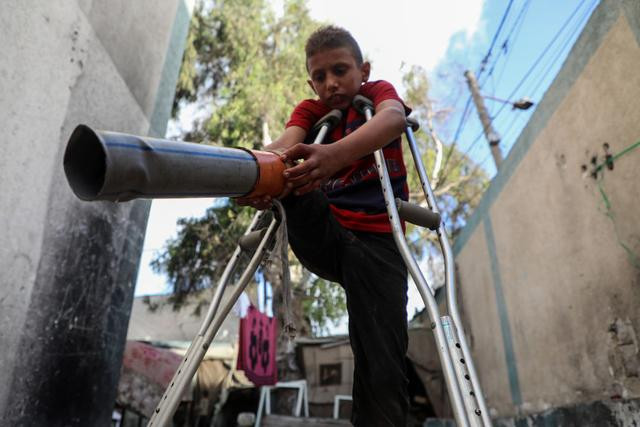 在加沙地带中部代尔拜拉赫附近的联合国临时安置机构内,年仅10岁的少年拉提卜·阿布·卡里克拄着拐杖安装假肢(10月5日摄)。在数月前的一次以色列空袭中,拉提卜失去了右腿致残,他的母亲和兄弟在袭击中身亡。